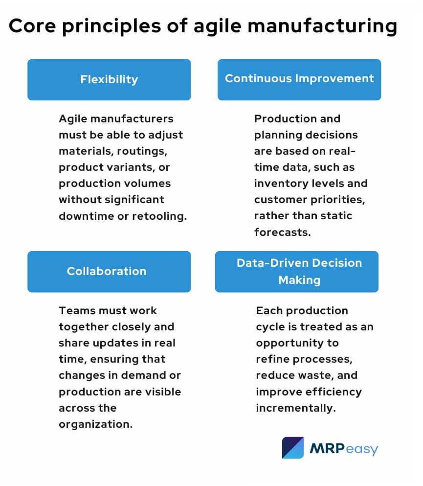 • Agile manufacturing is a production approach built on flexibility, rapid iteration, and real-time feedback. The agile methodology helps manufacturers respond quickly to changing customer needs, product specifications, or market conditions.